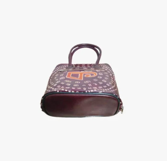 The handbag in the image is a Madur Kanthi bag, a traditional Indian accessory known for its unique craftsmanship. The bag features a beige and red woven design, with a red handle and trim. The top edge is adorned with a red and black floral patterned fabric, adding a touch of elegance. The bag's body is made from a sturdy woven material, possibly bamboo or rattan, giving it a natural and earthy feel. The overall design is simple yet stylish, making it a versatile accessory for everyday use.