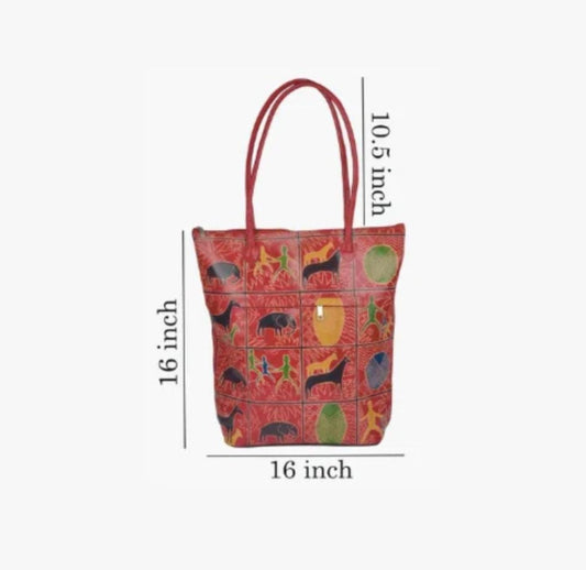 The bag's shape is structured, with a sturdy base that tapers slightly towards the top, giving it a unique silhouette. The most distinctive feature is the bright red handle, which is made from a smooth, possibly wooden or plastic material. The handle is attached to the bag with blue fabric or woven strips, adding a pop of colour and creating a visually appealing contrast with the red.