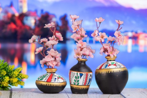 Handmade Terracota Earthen Innovation Clay Warli printed Beaded designs Set of 3 Red Flower Vase for Indoor Home Decoration, Resort Decoration, Pen Pot and Ideal for Gifting .