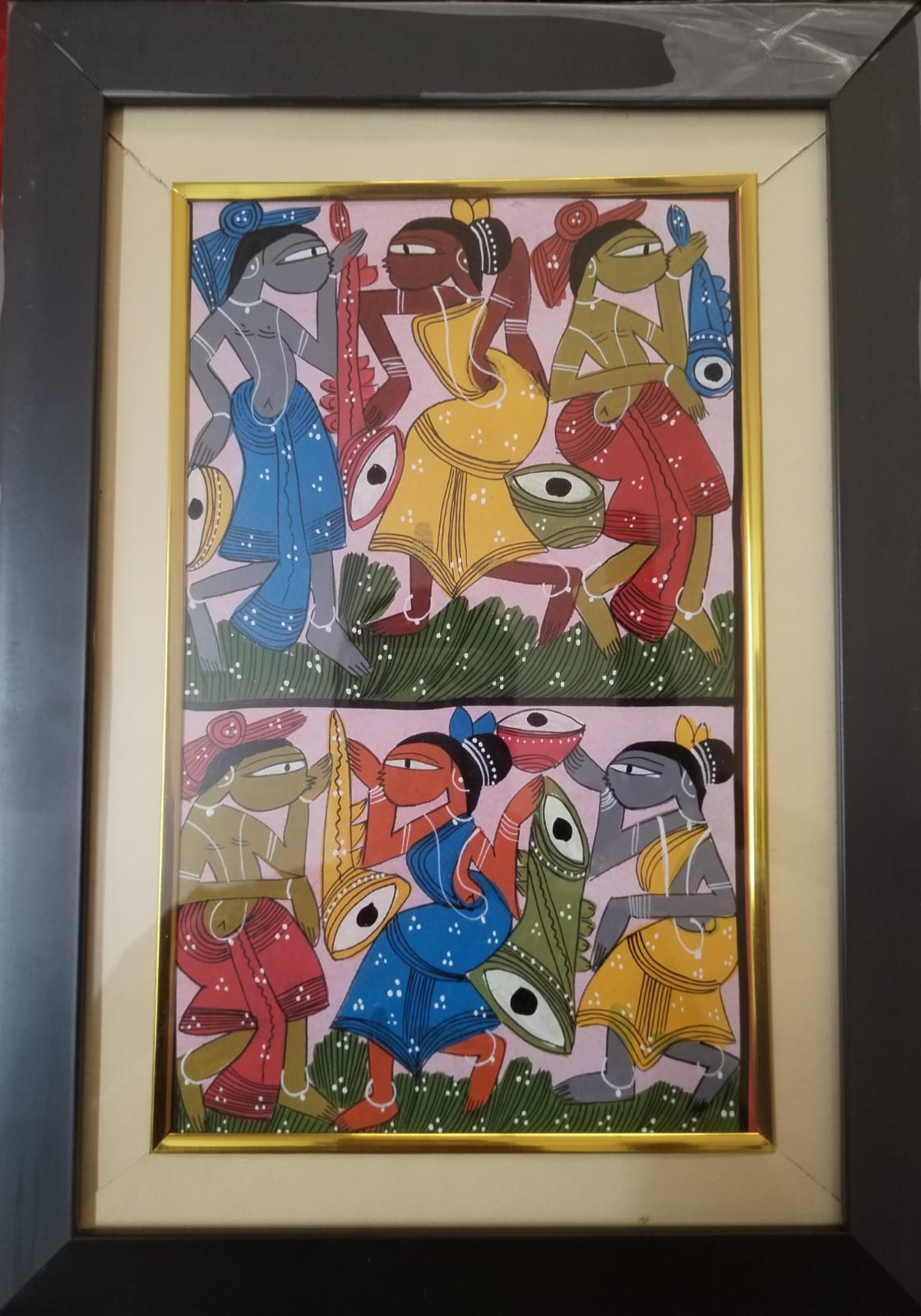 Bengal Pattachitra is a traditional scroll painting style from West Bengal, India. “ Bengal Pattachitra 3 Men & 3 Women With Musical Instruments” depicts Gents & Ladies figures playing musical instruments, showcasing intricate folk-art details, vibrant colors, and mythological or everyday cultural themes typical of Pattachitra style.