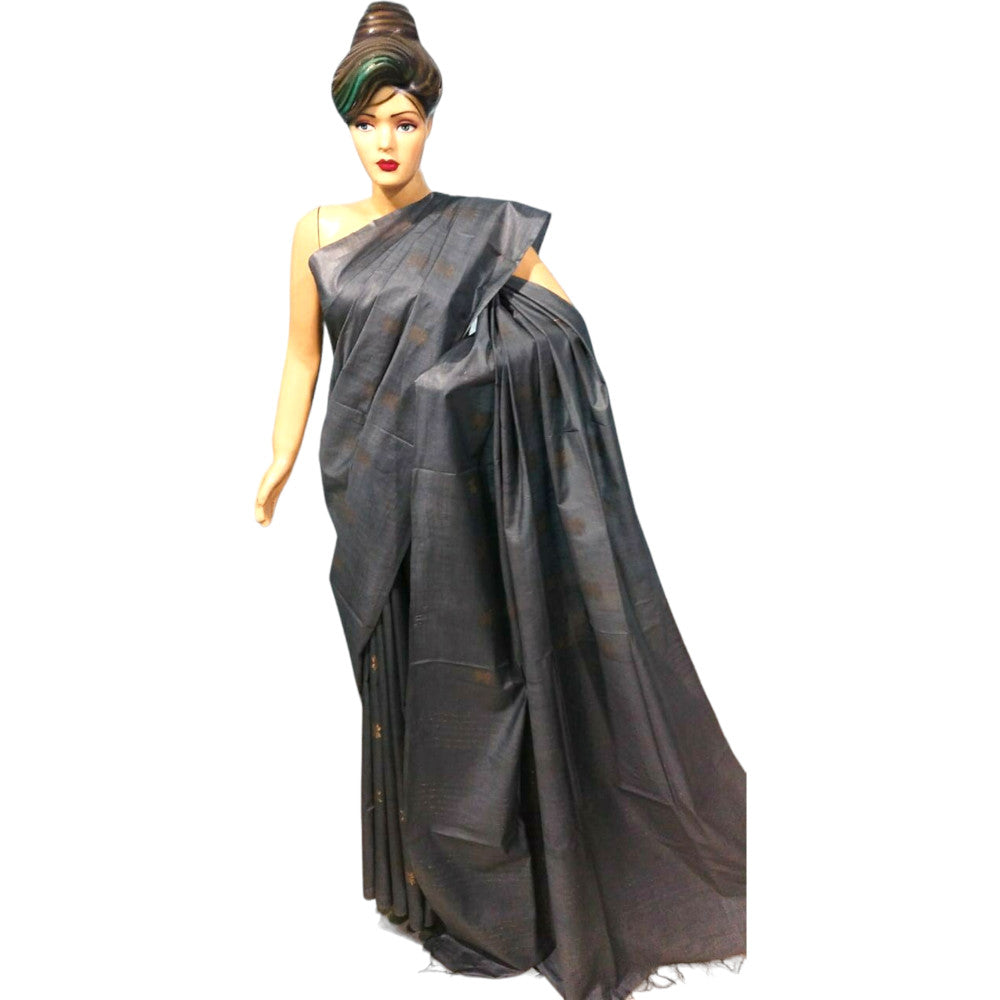 This elegant grey handloom saree exudes sophistication with its understated charm. The serene grey tone is complemented by intricate weaving patterns, showcasing the artistry of skilled weavers.