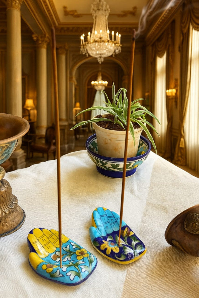 Handcrafted blue pottery Hamsa hand incense stick holder featuring intricate traditional patterns. Perfect for spiritual ambiance and decorative display.