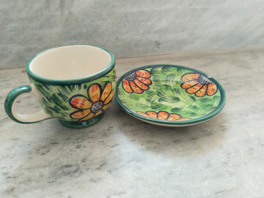 A vibrant orange floral print on a beautiful blue background Made from ceramic material for durability Gold accents add a touch of elegance Perfect for daily tea/coffee or as a decorative piece