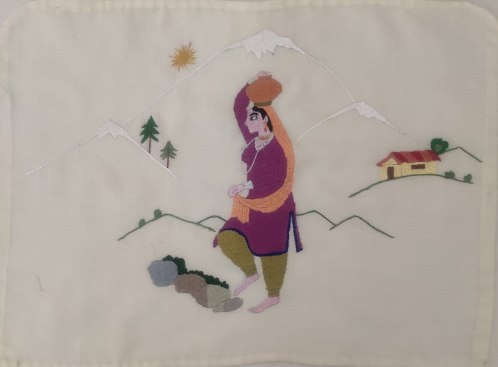 The Chamba Rumal is an exquisite traditional embroidery art form originating from the Chamba region in Himachal Pradesh, India. Often depicting cultural and mythological themes, one captivating design features a lady gracefully carrying a pot on her head. Intricately embroidered on a square piece of cloth, this portrayal showcases the skilled craftsmanship and vibrant colours typical of Chamba Rumal. The elegant scene encapsulates the cultural richness and artistic heritage of the region, making it a cherished and symbolic representation of Himachal artistry.