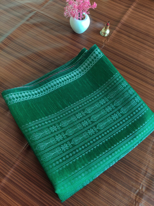 "Graceful and captivating, this green Champa silk saree dazzles with its rich contrast and lustrous weave — a perfect blend of tradition and timeless style."