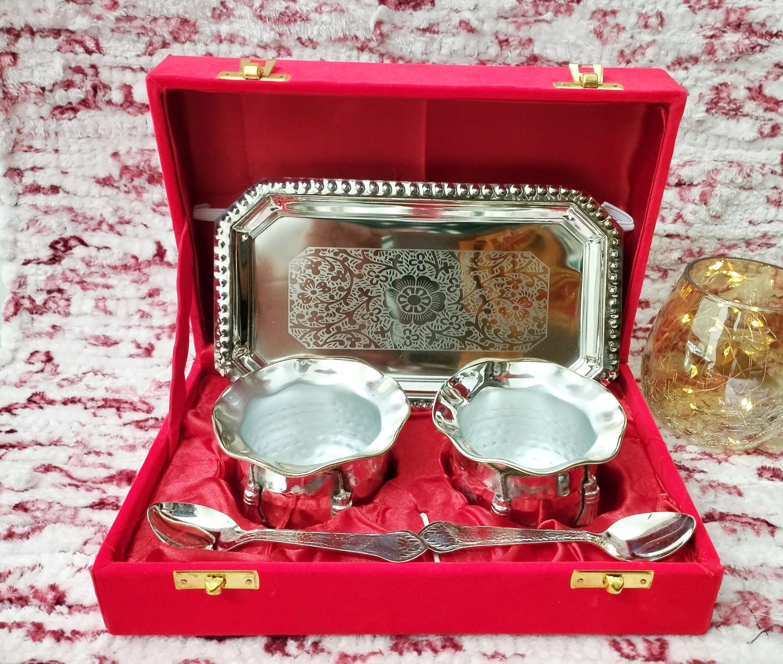 Moradabad Red Box Tray With 2 Jar And 2 Spoon