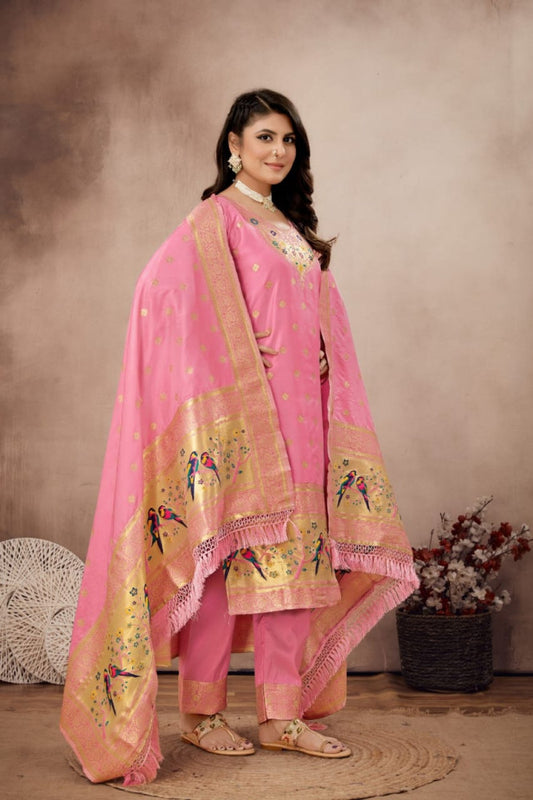 Make a bold statement with our Paithani Saree in dark yellow adorned with a golden Pallu. The striking combination of colors, coupled with intricate motifs, exudes elegance and charm. Crafted with finesse, this saree is sure to turn heads at any occasion.