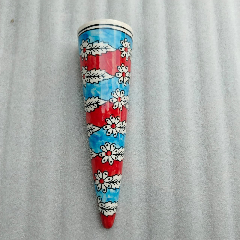 A Blue Pottery Cone Wall Planter Floral Design is a handcrafted ceramic wall-mounted planter shaped like a cone, decorated with detailed floral motifs. It features vibrant blue glazes and intricate flower patterns, combining traditional artistic craftsmanship with functional decor. This design adds a colourful and elegant touch to indoor or outdoor wall spaces, highlighting floral beauty and cultural artistry.