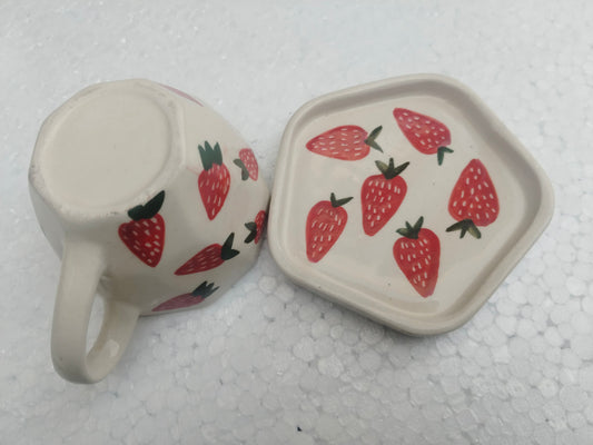 Add a sweet touch to your table with this handmade Blue Pottery Cup Coaster featuring a charming Strawberry Print design.