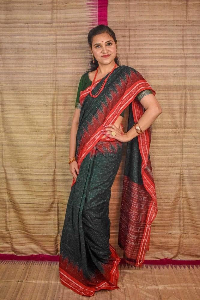 Embrace the timeless beauty of the Bottle Green With Red combinations in this stunning Odisha Ikkat Khandua Cotton Saree. Perfect for adding a touch of elegance to any occasion, this saree is a must-have for any fashion-forward individual.
