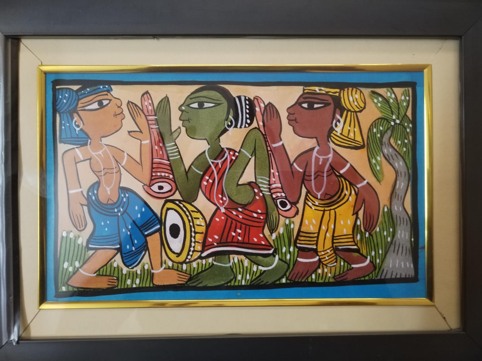 Bengal Pattachitra is a traditional scroll painting style from West Bengal, India. “ Bengal Pattachitra 2 men with women framed 10x14 inches” depicts Gents & Lady figures playing musical instruments, showcasing intricate folk-art details, vibrant colors, and mythological or everyday cultural themes typical of Pattachitra style.