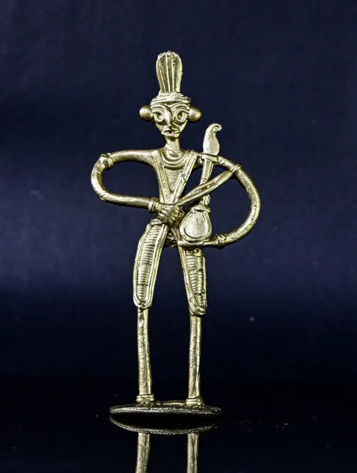 A Bengal Dokra Adivasi man, adorned in traditional attire, plays the Banam, a handcrafted tribal string instrument. His fingers move rhythmically, producing haunting, soulful melodies. The Banam, made from wood and animal hide, echoes the rich heritage of Adivasi culture, connecting generations through its deeply spiritual and ancestral music.