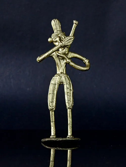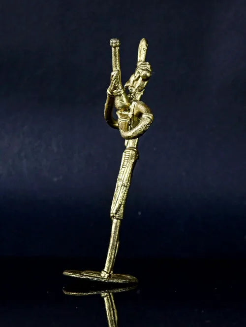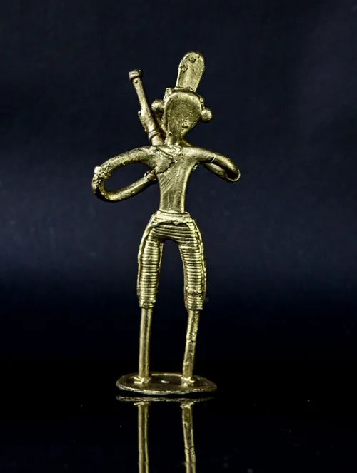 A Bengal Dokra Adivasi man, cast in brass with intricate detailing, sits calmly with a traditional hukkah. His relaxed posture and expressive features reflect rural serenity and cultural depth. This handcrafted sculpture symbolizes the slow-paced, reflective lifestyle of tribal communities, preserving their heritage through the timeless art of Dokra metalwork.