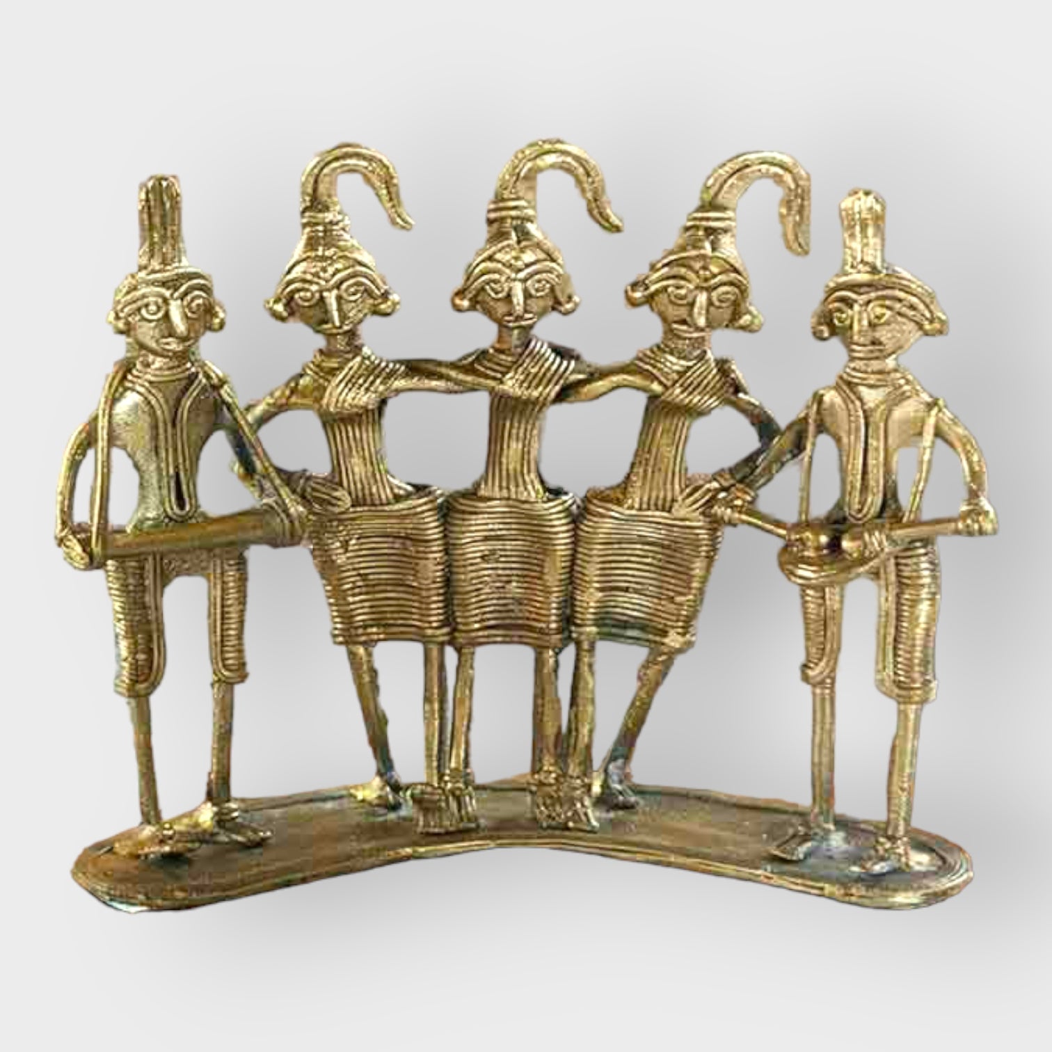 The Bengal Dokra Musicians and Dancer Ensemble Table Decor captures the essence of traditional Bengali artistry. Handcrafted by skilled artisans, this ensemble features intricate Dokra sculptures of musicians and dancers, reflecting the rich cultural heritage of Bengal. Each piece is meticulously designed, showcasing the unique craftsmanship and attention to detail. Perfect for adorning tables or shelves, this decor ensemble adds a touch of elegance and authenticity to any space, celebrating the vibrant traditions of Bengal through its exquisite art form.