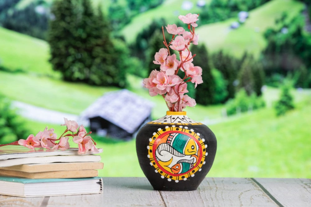 Handmade Terracota Earthen Innovation Clay Warli printed Fish designs Black Flower Vase for Indoor Home Decoration, Resort Decoration, Pen Pot and Ideal for Gifting .