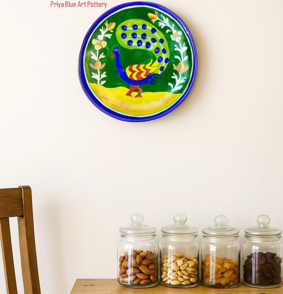 This Blue Pottery Wall Hanging Plate featuring a Peacock Print is an exquisite fusion of traditional craftsmanship and contemporary design. Handcrafted by skilled artisans, the plate showcases a richly detailed peacock motif painted on a deep blue glaze, symbolizing grace and prosperity. Its vibrant design and meticulous detailing make it an eye-catching decorative accent perfect for adding a touch of cultural elegance to any living space, be it your home, office, or creative workspace.