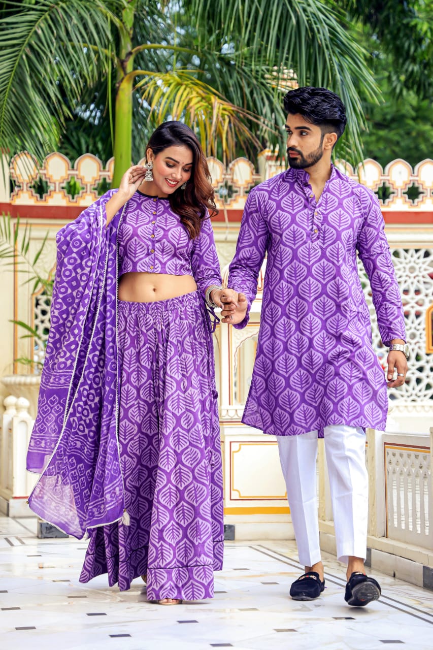 Celebrate together in the Bagru Print Festival Special Couple Dress Collection — matching Chaniya Choli and Kurta Pajama crafted in soft cotton mulmul with traditional hand-block Bagru motifs, vibrant festival colors, breathable comfort, and easy-going silhouettes for a coordinated, timeless ethnic look.