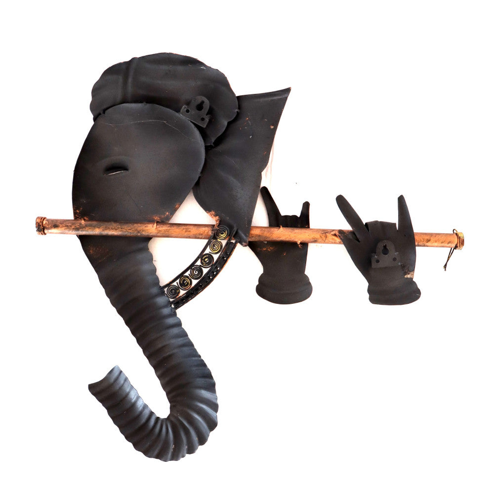 The Ganesh holding a bansuri (flute) sculpture from Bastar Iron Art is a stunning piece of craftsmanship by talented artisans of the Bastar region in India. Made from iron, it portrays Lord Ganesha, the Hindu deity of wisdom and music, in a graceful pose, holding a bansuri flute. This artwork beautifully captures the essence of both artistic and spiritual elements, showcasing the rich cultural heritage and intricate skills of Bastar's artisans. It's a remarkable representation of divinity through iron artistry.