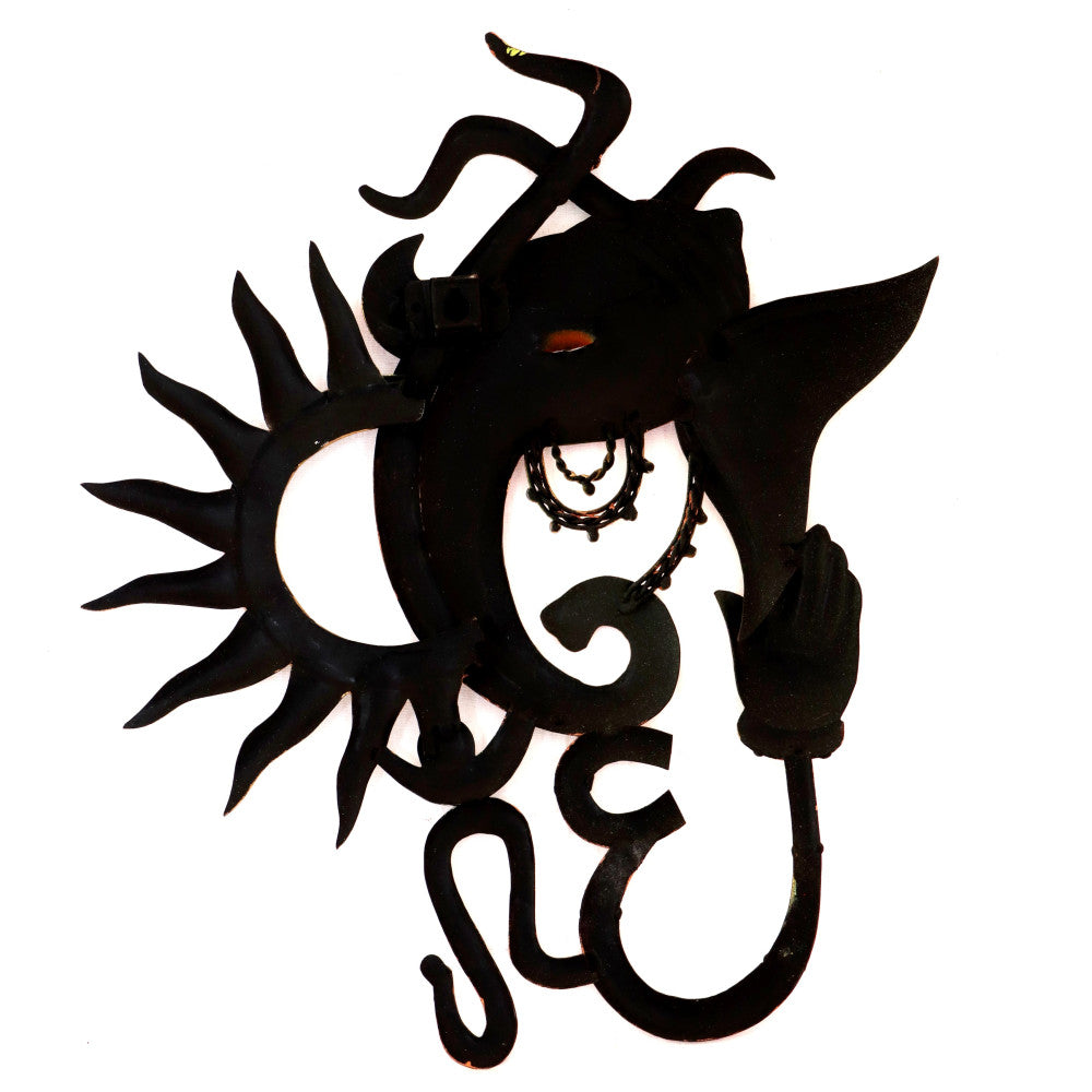 The Ganesh with OM wall hanging of Bastar Iron Art is a beautifully handcrafted piece originating from the Bastar region in India. Fashioned from iron, it depicts Lord Ganesh, the Hindu deity of wisdom and prosperity, alongside the sacred OM symbol. This intricate artwork seamlessly blends spiritual symbolism with artistic craftsmanship, making it a perfect addition to any home or sacred space. It represents the rich cultural heritage and artistic traditions of Bastar, showcasing both devotion and artistry in a harmonious blend.