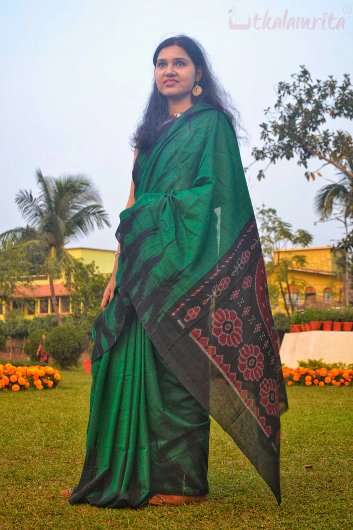 This green big temple saree is a heart-stealer! The pallu undoubtedly has the Konark wheel motif- the signature Odisha architectural marvel, surrounded by peacocks, butterflies, flowers, birds or other such pretty woven motifs.