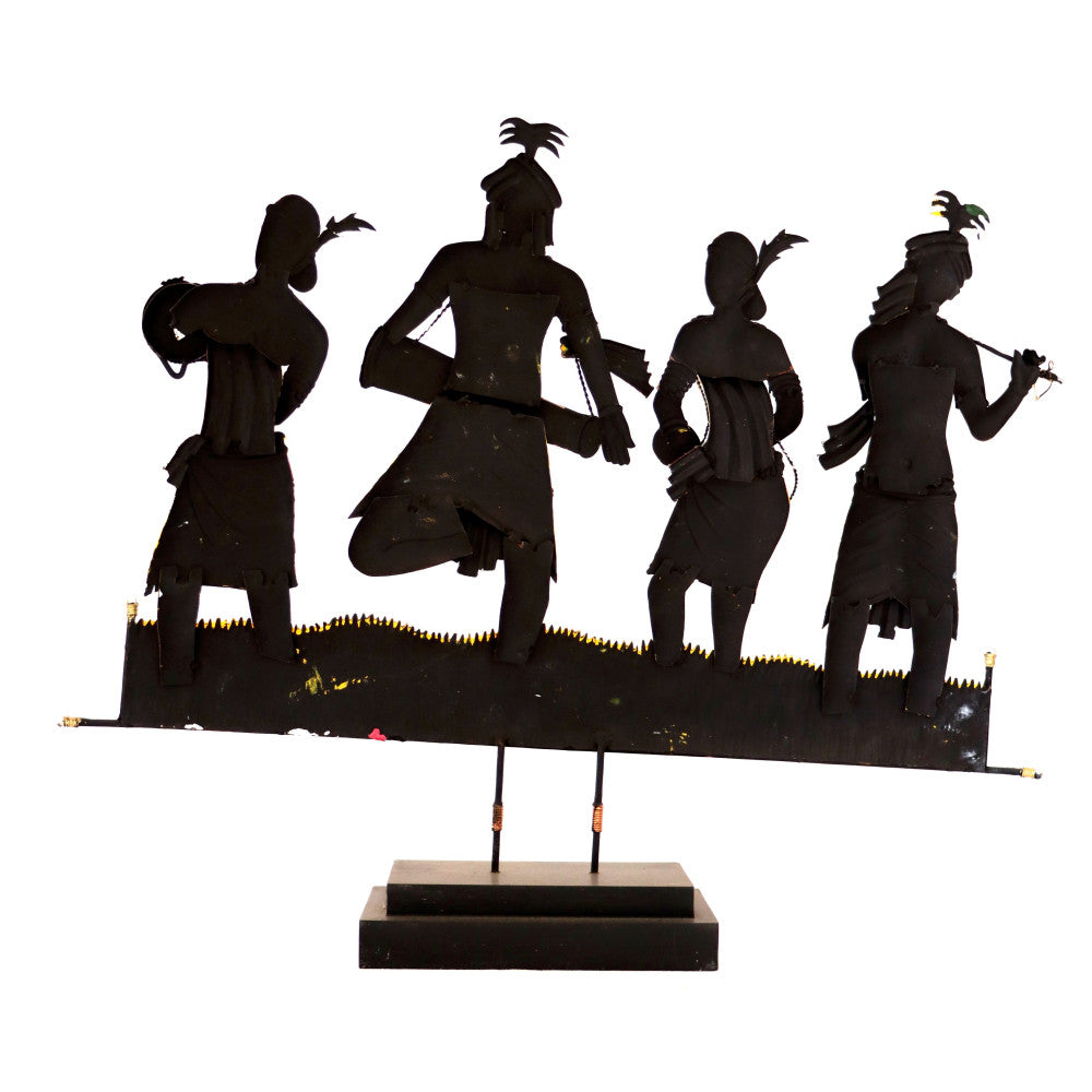 A group of four tribal figures in Bastar Iron Art forms a captivating tableau on a rustic, handcrafted field. These intricate sculptures, meticulously crafted by skilled Bastar artisans, depict tribal individuals engaged in various activities. Each figure exudes a sense of tribal life and culture, showcasing their connection to nature and community. This unique artwork is a testament to the rich artistic heritage of Bastar, capturing the essence of tribal existence in a captivating and visually striking manner.