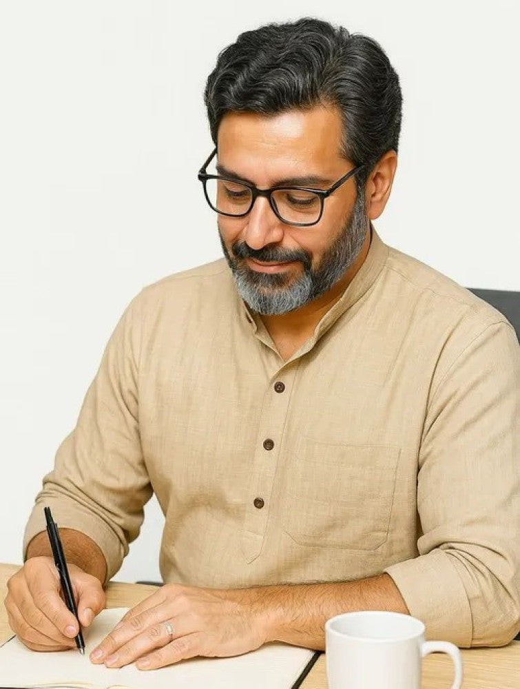 Premium hand-woven khadi cotton men's short kurta, crafted with natural dyes using the traditional technique ?an ideal, artful addition to elevate your casual wardrobe.