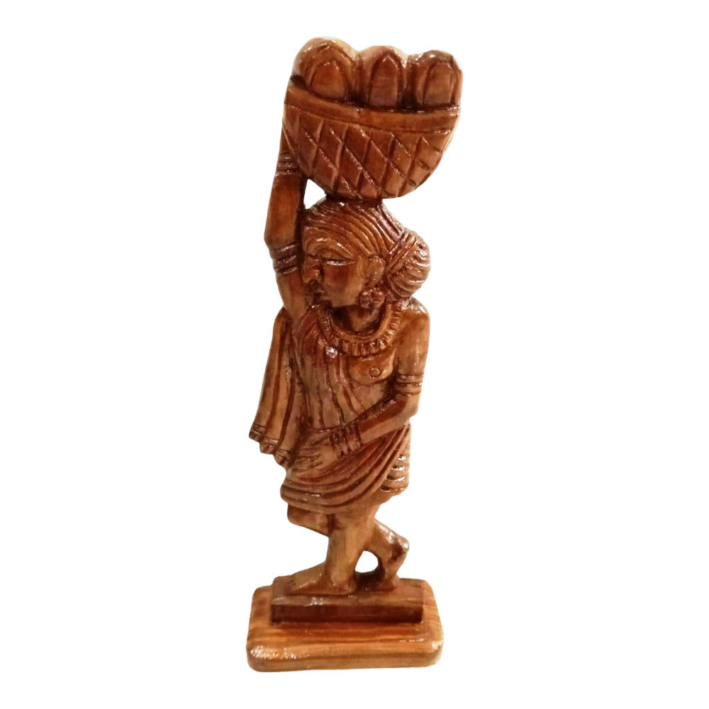 Madini, a graceful figure, balances a bounty of vibrant fruits atop her head with effortless poise. Crafted from Bastar wooden artistry, her figure embodies tradition and skill. Each fruit, meticulously carved and painted, adds a burst of color to her wooden canvas. This exquisite piece captures the essence of a rich cultural heritage, blending aesthetics with functionality, as Madini symbolizes the beauty and resilience of the artisans' craft in Bastar.