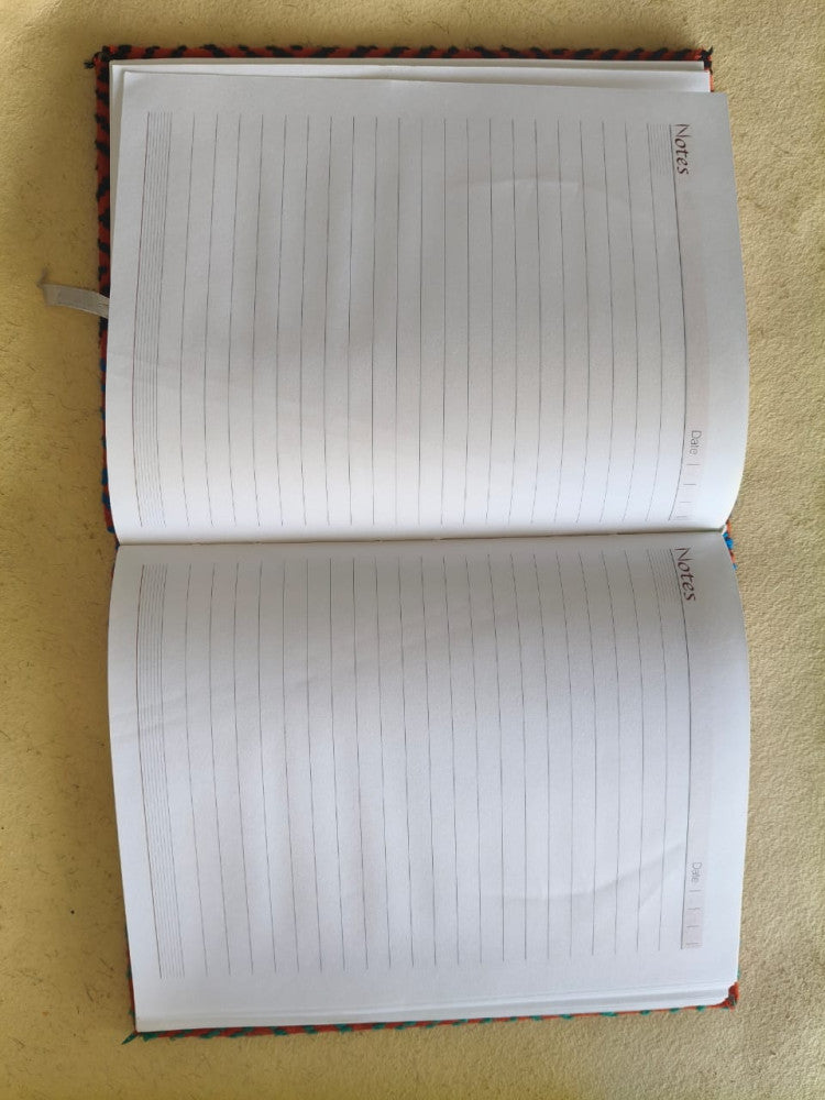 "This beautifully handcrafted notebook diary showcases vibrant green and orange Kheta embroidery, bringing a touch of tradition to your daily notes, thoughts, or creative ideas."