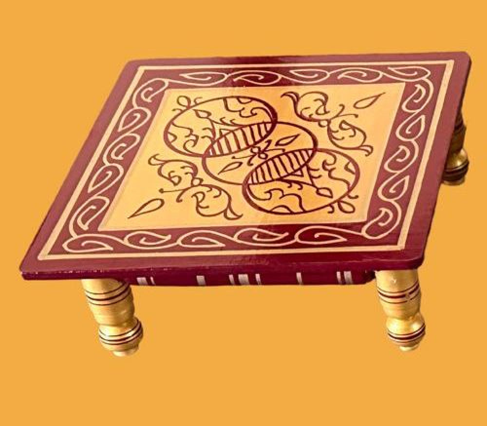 A traditional handcrafted wooden bajot from Sankheda, Gujarat, featuring the region's signature lacquerware craftsmanship. This piece is intricately designed with a vibrant goldenlacquer finish, showcasing the vibrant and ornate detailing characteristic of Sankheda furniture. Ideal for adding a touch of cultural elegance to any pooja space or as a decorative platform for idols and kalash.