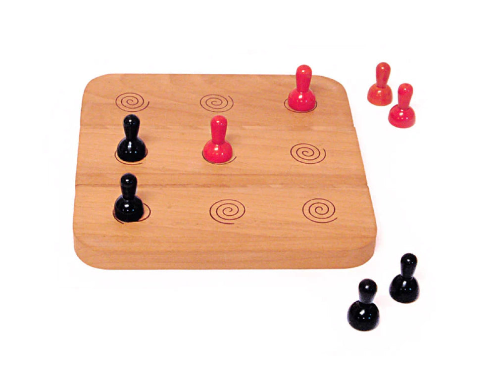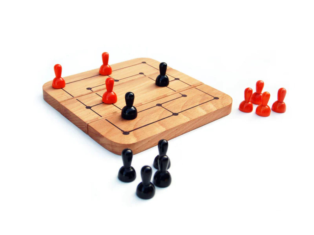 Six Men's Morris is a traditional strategy board game associated with Channapatna toys, a renowned craft from India. It involves two players who strategically place their six pieces on a gridded board to form lines, aiming to capture their opponent's pieces. Channapatna toys are famous for their colorful wooden craftsmanship and eco-friendly materials, making the game not only intellectually engaging but also a testament to the rich heritage of Channapatna artisans.