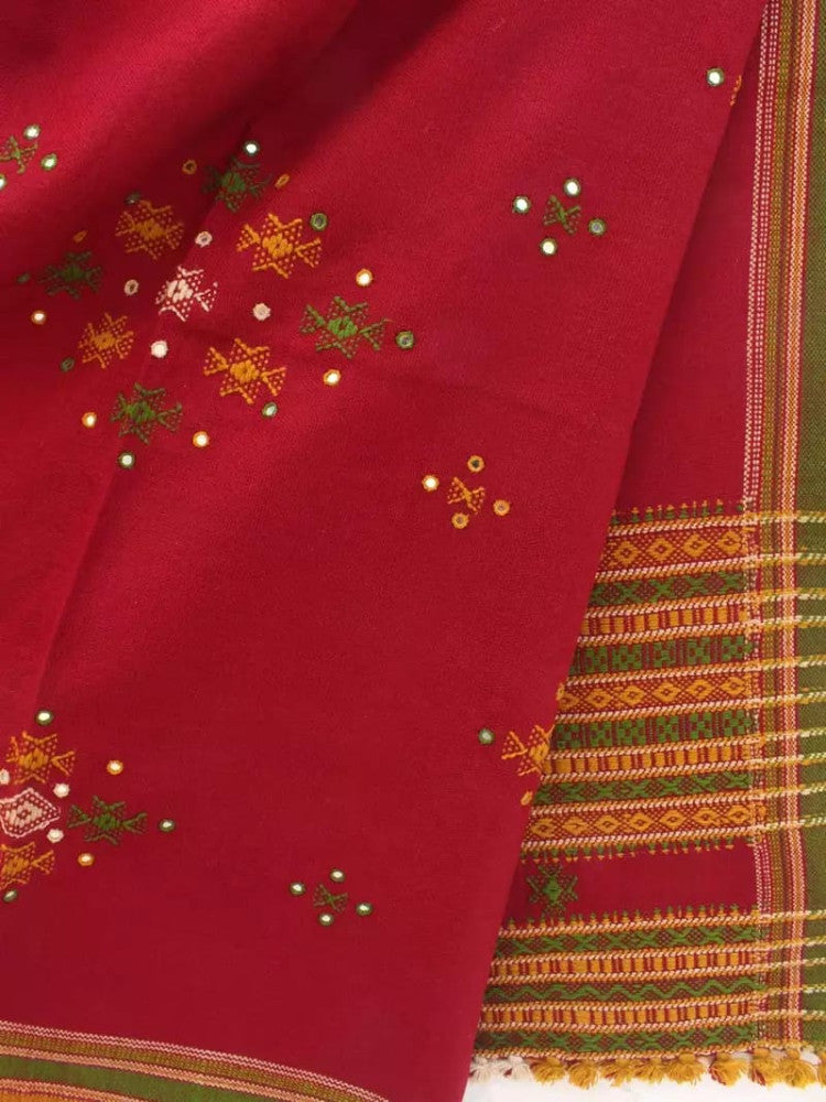 Elegant maroon woolen shawl from Kachchh, adorned with intricate mirror work. This artisanal masterpiece blends traditional craftsmanship with modern flair, creating a captivating accessory that exudes warmth and style.